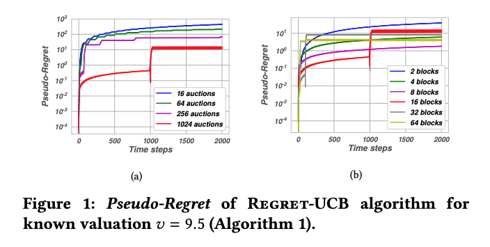 The first figure shows how the pseudo-regret converges over time for different numbers of auctions and blocks for known valuation. Blocks correspond to the number of different bids submitted per time period to the available auctions.