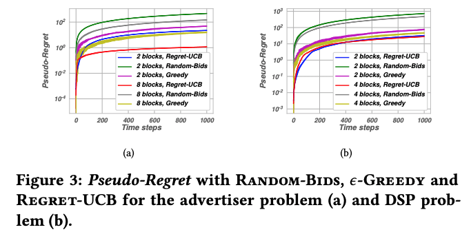 Figure 3 shows the Regret-UCB is generally superior to random bids and epsilon-greedy for different block selections in both the advertiser and the DSP problem.