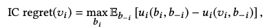 IC-regret is the maximum expected difference in utility between selecting the optimal bid b_i and bidding valuation v_i given bids of other bidders b_(-i). IC-regret is zero for IC-mechanisms.